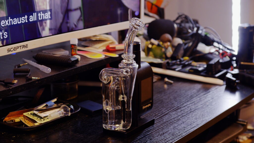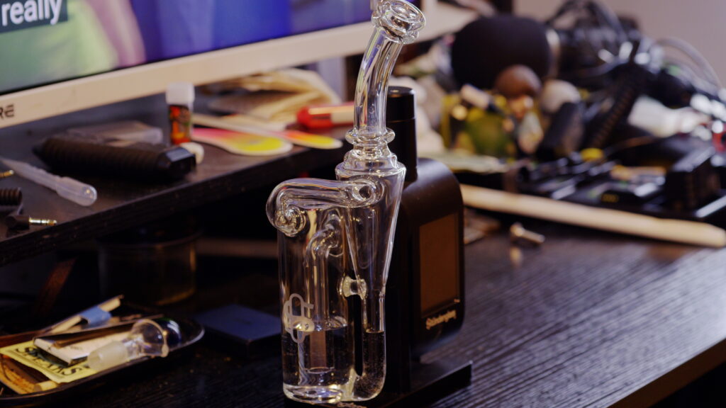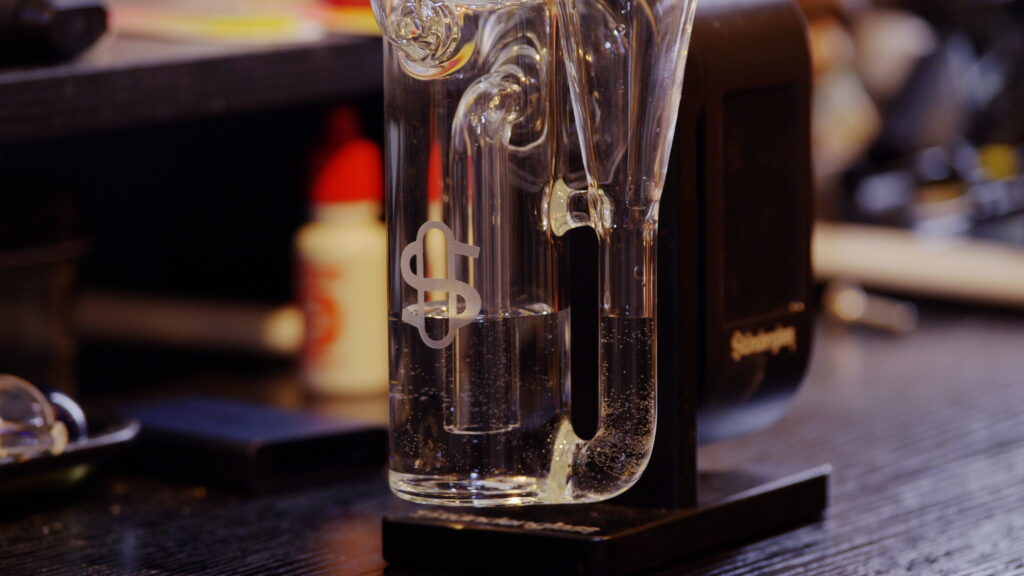When shopping for a smoker who really doesn’t need a lot of accessories to consume her medicine, it can be a little difficult to find something they would enjoy more than extra rosin. I know she uses her Modul all the time, so why not give Studenglass’ website a once over. They had a special going for their website so most of the items were selling out fast. I originally saw a base light for the stand up traditional Studenglass water pipe. Nah, not cool enough. How about a Y splitter so two people can use it at one time………….that seems like a solution to a non problem for us. I keep scrolling and go past the original replacement glass and find the new recycler. That’s it! I know she will use that! I added it to the cart along with a replacement chamber cap because they get gunked up. The piece came shipped in a plain over-box with the recycler wrapped in bubble wrap inside of its own box. Shipping was quick for the holiday season. The recycler is just a little bit bigger than the original glass that comes with the Modul. It is sturdy, yet feels more fragile at the same time. This partly due to the design. I did not worry about it breaking during use as it snapped into place on the Modul, thanks to the built in magnets. It was filled with reversed osmosis water. It was filled just below the S on the etched Studenglass logo. The draw on this piece is different due to having 2 chambers the smoke has to work through along with the water. Once you get the hang of the draw, it provides for some amazing hits. I used it with Kush and Kreme from Ozone (Cresco IL Brand). I let the concentrate tank heat up before I dropped in a small dab. I dab at 530F and it is a nice balance of a thick cloud along with a nice rich hit. It cools the vapor just enough, not like through an ice pipe but it is enough. This recycler makes it feel like a more concentrated hit with less effort over the original glass piece. Cleaning is the same as the original. We use Formula 420’s 710 cleaner or the everyday 420 cleaner. It removes all of the residue and drys clear, unless you miss a spot. If you are looking to upgrade the Modul but don’t want the big stand, look at getting the recycler.