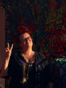 As we walked around Evolution Fest 2025 we saw another artist whom we watched down at Paint Louis a little under two months ago. She was on a lift working on this giant spiral mural on the flood wall located on Wharf St in St. Louis. She has been a featured artist for many years at that event and her art work has been featured at Patreon’s headquarters, Paint Louis, Target, and Kranzberg Arts Foundation. She was a featured artist at Evolution Fest with a partnership from the Regional Arts Commission of St. Louis.