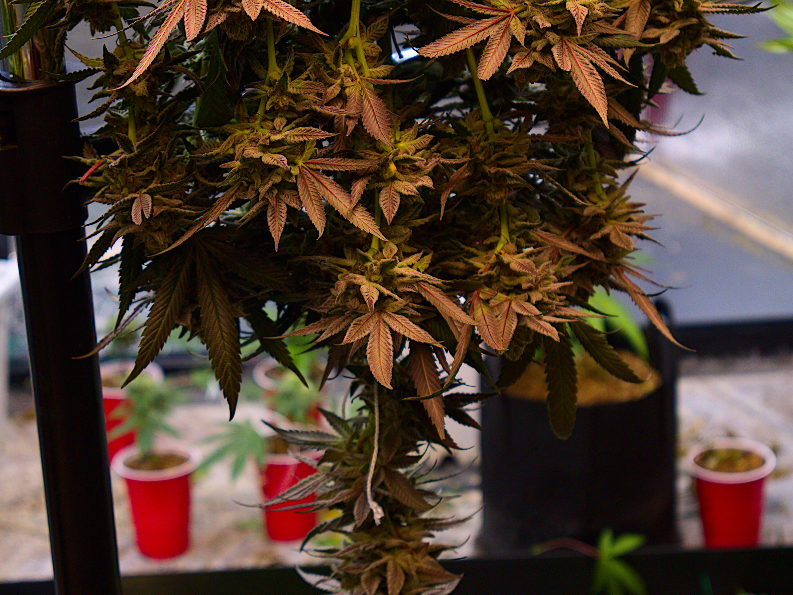 We really won’t know until we let it fully dry and cure. Don’t worry, Clutch has been pinching off little pieces to ensure they are drying well enough before cure. I can safely report back that there is no harsh hay smell or taste. During the drying you can smell the change in dry points. One day the room smells of wet leaves and plants, the next it smells of dank. To combat humidity we had to have a dehumidifier running to pull all of the extra moisture out of the air. Downside is it is a warm air dehumidifier. It dries the air but also raises the room temperature slightly. We trimmed the plants and hung them on clothing racks we bought off Amazon for under $30 bucks. We spent a little more for the extended reach. It becomes useful when you need to keep bushy plants separated.